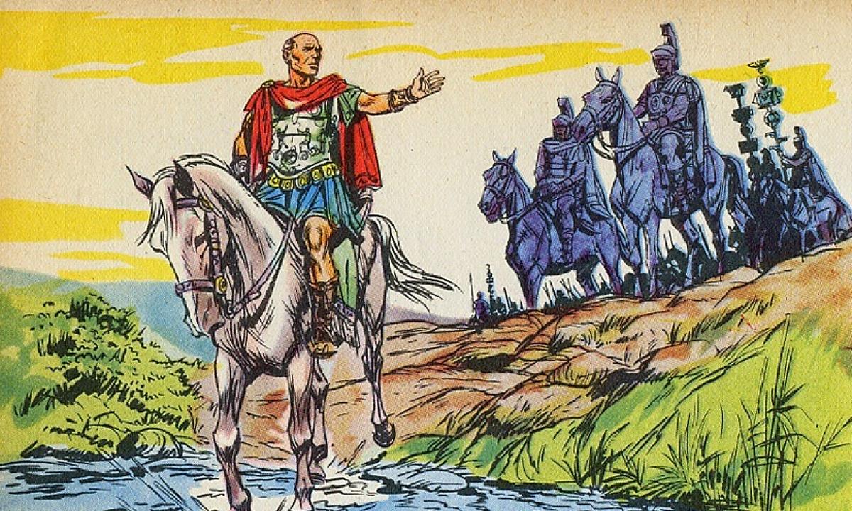 Nella notte tra il 10 e l’11 gennaio 49 a.C. Giulio Cesare attraversa il Rubicone, fiume che allora segnava il confine oltre il quale un generale romano non poteva portare le armi. Questo è l’atto che segnala l’inizio della guerra civile con Pompeo e il Senato.